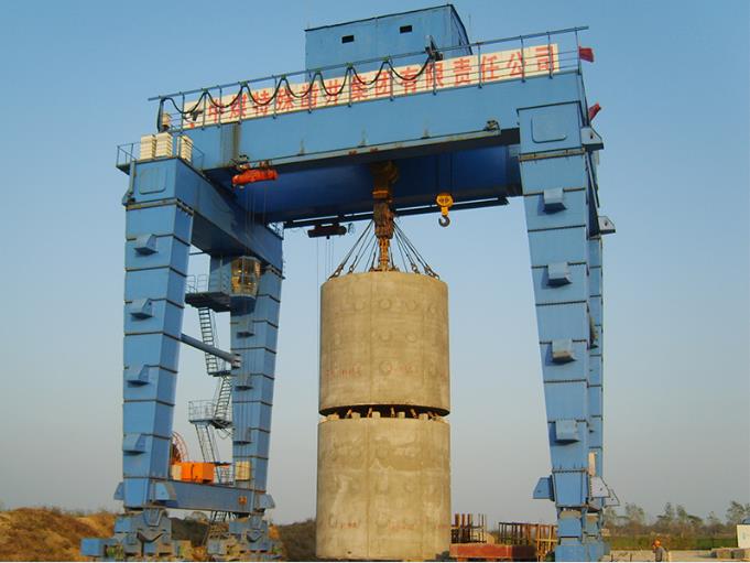 自頂升門式起重機(jī)和U型門式起重機(jī)類似,門架結(jié)構(gòu)為U型門機(jī),區(qū)別在于支腿不同。由于其它工作場(chǎng)合,大型起吊設(shè)備無法進(jìn)場(chǎng),自頂升門機(jī)支腿制作成幾段,每段支腿上都有千斤頂頂升支座。小車、主梁端梁組裝好后,采用千斤頂頂起,依次將每段支腿用法蘭連接到一起。之后安裝下橫梁、大車運(yùn)行機(jī)構(gòu)。