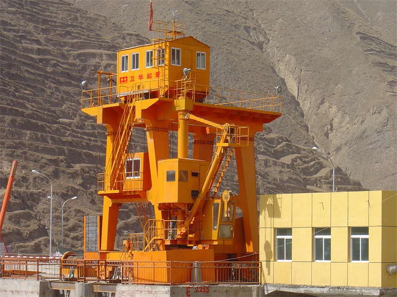 雙向門機(jī)大車沿壩體方向運(yùn)動(dòng),小車沿水流方向運(yùn)動(dòng)。一般配有多套抓梁,可對(duì)壩上不同中心線上的多孔閘門及攔污柵進(jìn)行啟閉??稍O(shè)置懸臂以增大門機(jī)工作范圍;部分門機(jī)配有回轉(zhuǎn)吊,回轉(zhuǎn)吊回轉(zhuǎn)半徑可達(dá)180°,可以輔助壩上設(shè)備的運(yùn)輸與安裝。