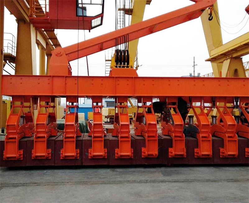 極炭塊堆垛起重機(jī)是炭素廠炭塊倉(cāng)庫(kù)的專用轉(zhuǎn)運(yùn)設(shè)備,該設(shè)備主要有橋架、大車運(yùn)行機(jī)構(gòu)、起升機(jī)構(gòu)、導(dǎo)向裝置、夾鉗裝置、控制系統(tǒng)、電動(dòng)葫蘆等部分組成。其用于陽(yáng)極炭塊庫(kù)中抓運(yùn)生、熟炭塊,及其它零星吊運(yùn)。其自帶的夾具每次抓取19或21塊縱向排列的陽(yáng)極炭塊進(jìn)行往返堆垛或裝車,也可實(shí)現(xiàn)廢塊的取出及合格塊的插入,可堆積9層。